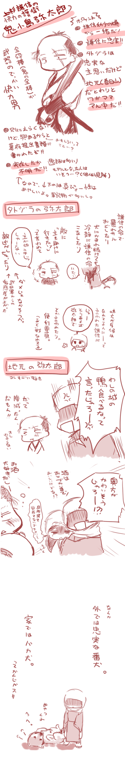 弥太郎好きなんですよ。 2017年04月24日 創戦 謙信さんと。 0 http://fuyuiroemaki.edoblog.net/%E5%89%B5%E6%88%A6%E3%80%80%E8%AC%99%E4%BF%A1%E3%81%95%E3%82%93%E3%81%A8%E3%80%82/%E5%BC%A5%E5%A4%AA%E9%83%8E%E5%A5%BD%E3%81%8D%E3%81%AA%E3%82%93%E3%81%A7%E3%81%99%E3%82%88%E3%80%82弥太郎好きなんですよ。 鬼小島弥太郎さん。 うろ覚えの記憶及び私的解釈で書いてる。軍記物だけど、弥太郎くん17歳(謙信と出会う前)の初めての戦とか、ちび謙信とニアミスしてるのとか、若弥太郎の一番槍(かっこいい)とかも好き。それぞれ数行(だったと思う)の謎エピソードだけど。あと、↑ではコメディに書いてるけど、弥太郎が春日山の鴨食べたエピソードは、お腹がすいていてる酔っ払いだからではなく、度胸試し及び、禁を破っても「俺は」謙信に処刑されないって不遜さの逸話だと思います。 [2回]PR