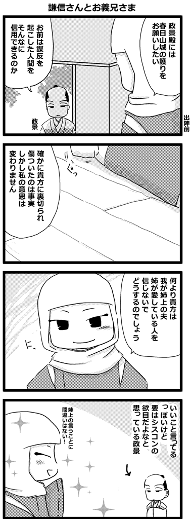 [漫画]謙信さんとお義兄さま 2014年12月30日 創戦 謙信さんと。 0 http://fuyuiroemaki.edoblog.net/%E5%89%B5%E6%88%A6%E3%80%80%E8%AC%99%E4%BF%A1%E3%81%95%E3%82%93%E3%81%A8%E3%80%82/-%E6%BC%AB%E7%94%BB-%E8%AC%99%E4%BF%A1%E3%81%95%E3%82%93%E3%81%A8%E3%81%8A%E7%BE%A9%E5%85%84%E3%81%95%E3%81%BE[漫画]謙信さんとお義兄さま 上杉謙信 長尾政景(綾姫夫、景勝父) なんとなく白黒トーンで書いてみたけど、今までのとどっちのがいいかしらって悩み中です。 [0回]PR