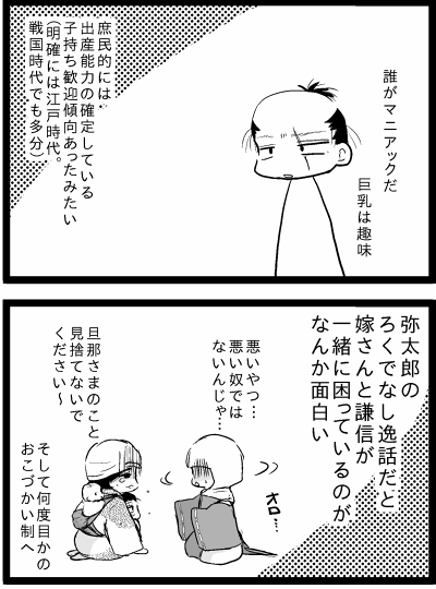 [漫画]謙信さんと初めての京都 おまけ 2016年11月05日 創戦 謙信さんと。 0 http://fuyuiroemaki.edoblog.net/%E5%89%B5%E6%88%A6%E3%80%80%E8%AC%99%E4%BF%A1%E3%81%95%E3%82%93%E3%81%A8%E3%80%82/-%E6%BC%AB%E7%94%BB-%E8%AC%99%E4%BF%A1%E3%81%95%E3%82%93%E3%81%A8%E5%88%9D%E3%82%81%E3%81%A6%E3%81%AE%E4%BA%AC%E9%83%BD%E3%80%80%E3%81%8A%E3%81%BE%E3%81%91[漫画]謙信さんと初めての京都 おまけ 上杉謙信(長尾景虎) 鬼小島弥太郎 弥太郎の奥さんなんか好きで。 弥太郎の嫁さんと息子、実は相当前から存在してた。(逸話関係で二人が出てくる漫画書いてたんだけど、ちょっと疑問が出てきたので、調査して疑問解決したら書こうかな…と思ってる漫画の下書き)元ネタ(史料とか逸話とか軍記物とか)が何かとか書いた方がいいのかしらとかたまにおもうのですが、わりとだいぶアレンジしてしまったり、自分個人の調査での解釈だったり、完全にオリジナルな部分なとこもあったりするので、説明むずかしい。次回更新は、綾姫と政景さんのコメディです。 [1回]PR